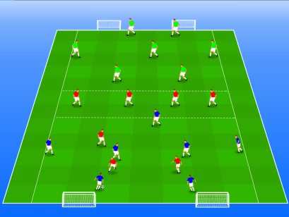 Er zijn drie teams van zeven spelers.Van het verdedigende team komen er drie spelers drukzetten ...