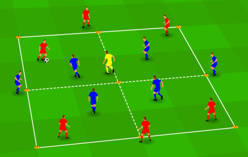 Een veld van 12 bij 12 meter, onderverdeeld in 4 vakken13 spelers per organisatie9 pylonen13 hesjesVoldoende ballen