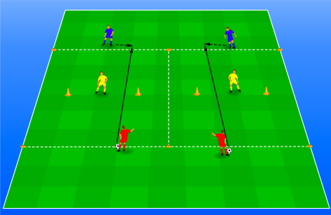 Beide spelers kunnen scoren door tussen de pylonen te passen.
