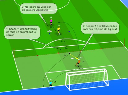 Keeper 1 dribbelt over de rode lijn en probeert te scoren (hij mag niet schieten voordat hij over de rode lijn is).Als keeper 2 het schot redt, heeft keeper 1 acht ...