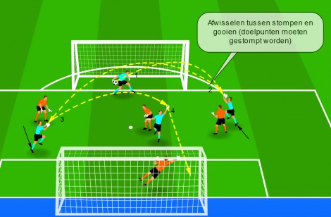 We spelen een partijvorm op een klein veld in het strafschopgebied met 2 grote doelen. Elk team heeft 1 keeper in het doel en 3 in het veld.De keeper in het ...