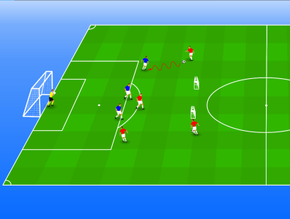De speler aan de buitenkant start met een 1:1+k.Vervolgens wordt er een bal ingespeeld vanaf de andere kant