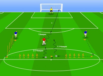 verbeteren van schieten vanuit een openspelsituatie, vanuit een 1:1-duel en vanuit een 2:1-duel