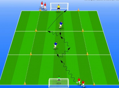 speler met bal moet proberen twee tegenstanders te passeren ...