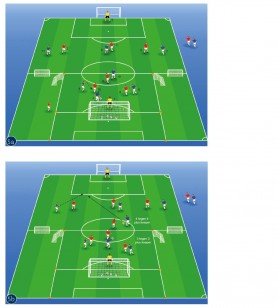 2 grote doelen met keeper4 kleine doeltjes1 vak breedte zestienmetergebied, lengte zestienmeter tot middenlijntweede vak half veld8 blauwe en 8 rode hesjes