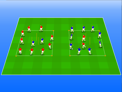 Twee teams van elf spelers.Van beide teams gaan twee spelers verdedigen op het andere veld.Op het fluitsignaal van de trainer wisselen de twee verdedigers door.Teams krijgen ...