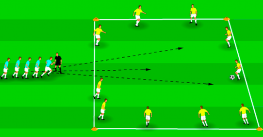 Doelverbeteren van het behouden van de bal in een toenemende drukteOrganisatieeen vierkant met 6-15 spelers die op balbezit speleneen rijtje met spelers dat de verdedigers vormteen stopwatch om te meten ...