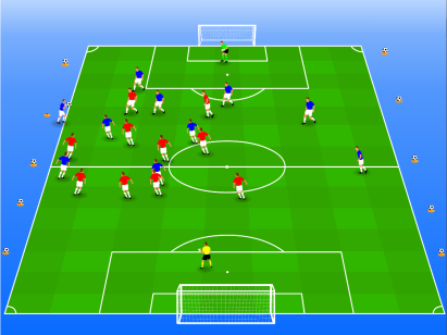 Er wordt 11:11 gespeeld.Om het veld heen liggen ballen op pylonen.