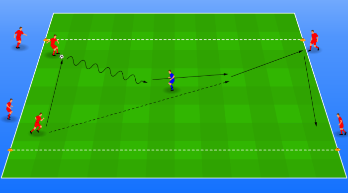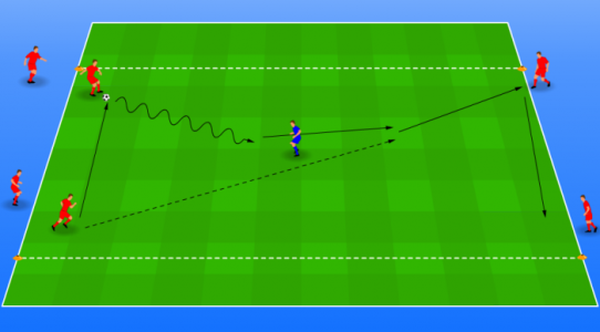- 2 spelers aan een kant starten met een pass van de een naar de ander