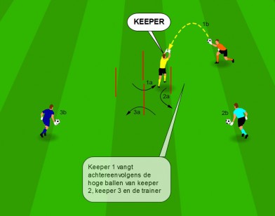 Keeper 2, Keeper 3 en de trainer werpen om de beurt een hoge bal achter elkaar in de ruimte tussen de stokken.Keeper 1 moet de juiste manier kiezen om de bal ...