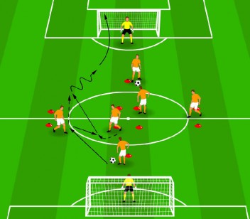 Twee doelen met keeperKruis formatie in het midden met dubbele potjes op de zijkant.