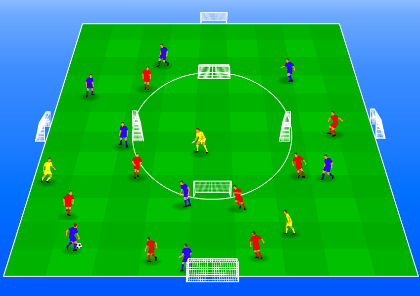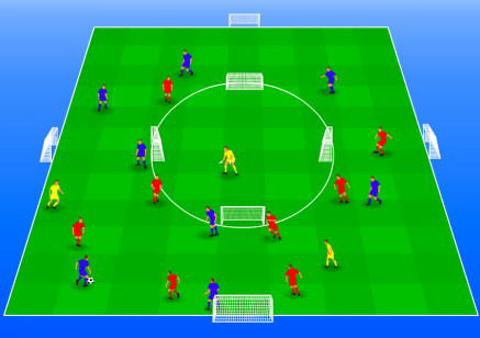 - het team in balbezit kan scoren na een derde man combinatie met de keeper in het midden (1x raken) op een van de 4 doeltjes in het midden