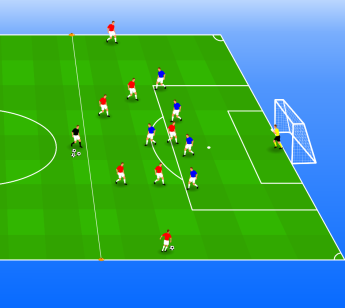 Rood valt steeds aan richting het doel van blauw.Verovert blauw de bal, dan kunnen ze de trainer inspelen.