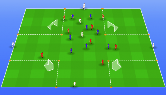 een veld in de vorm van een plusteken (+)kleine goals ...