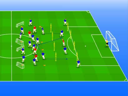Er wordt een 5:2 positiespel gespeeld.Na vijf keer overspelen mag een van de blauw spelers tussen de twee ...